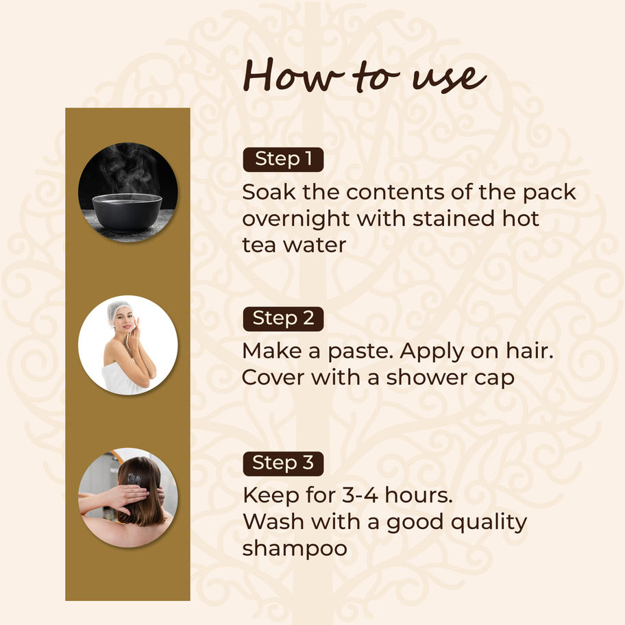Instructions: Soak the contents of the pack overnight with stained hot Tea water. Make a paste. Apply on hair. Cover with a shower cap. Keep for 3-4 hours. Wash with a good quality shampoo